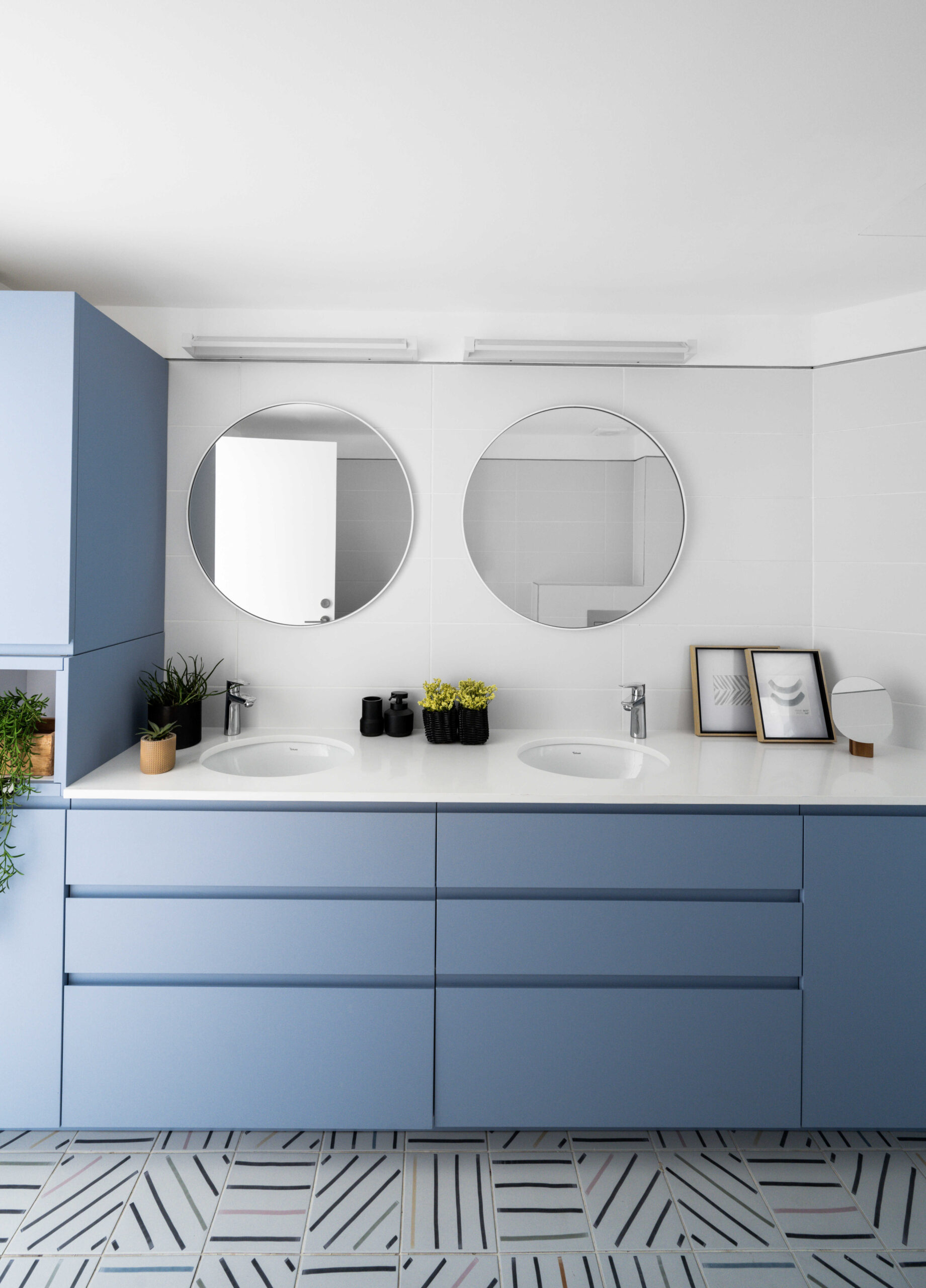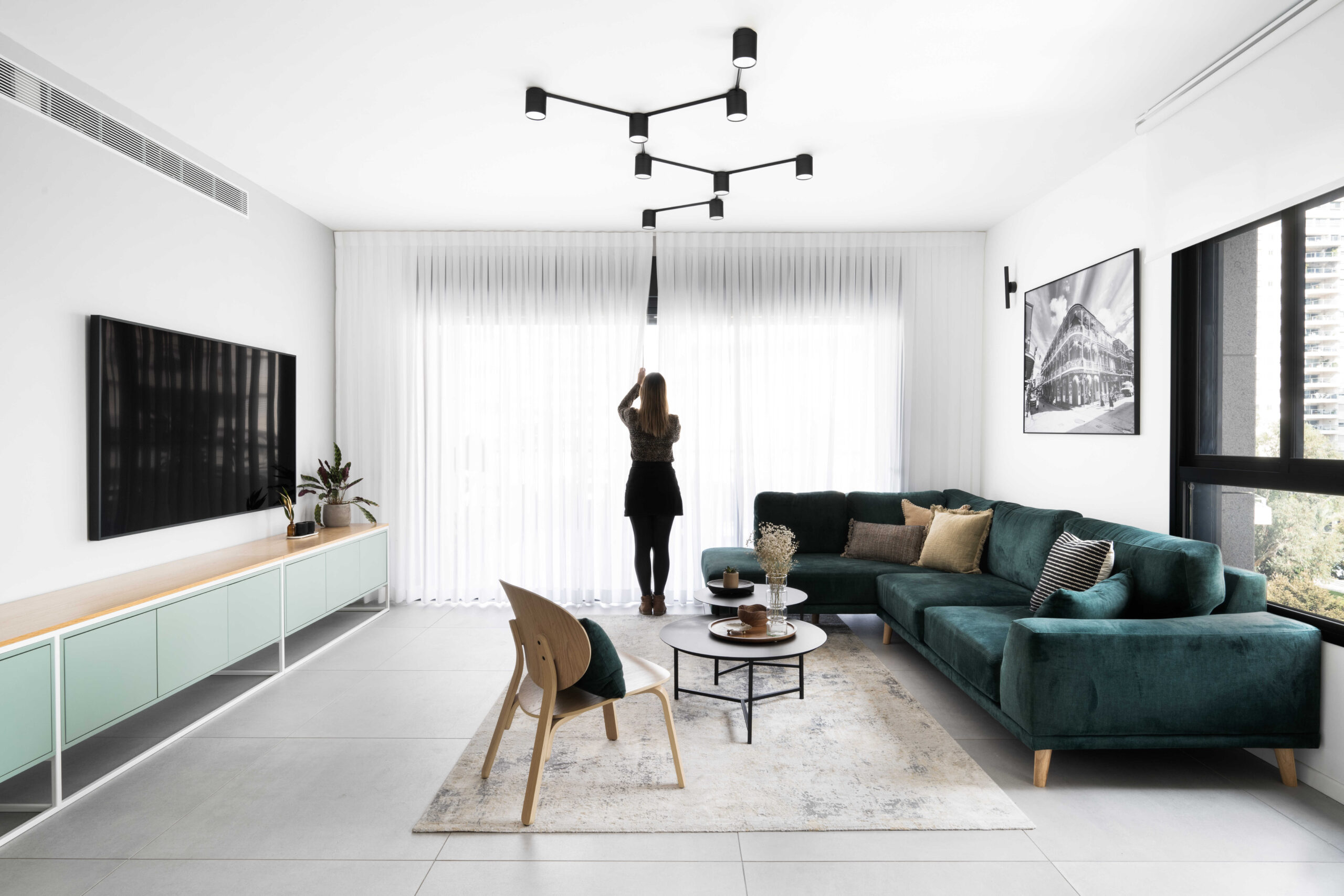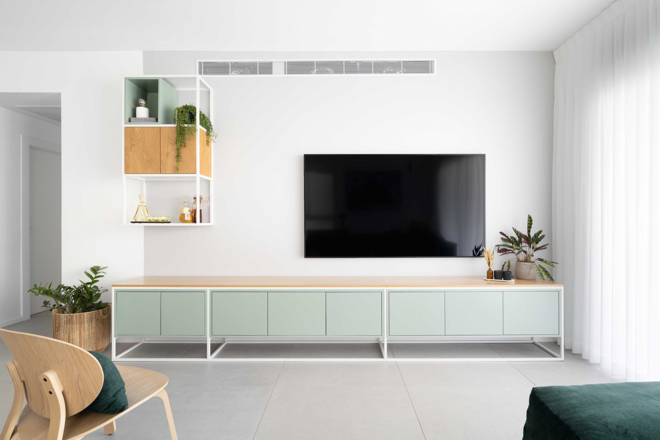 הסלון קיבל ספה צבעונית ורכה שהפכה לאלמנט כוח מרכזי, לצד שולחנות דקים ושטיח מאזן. בקיר הסלון תוכננה נגרות מסגרות אישית – פתרון אחסון ואסתטיקה המשתרע לאורך חמישה מטרים.