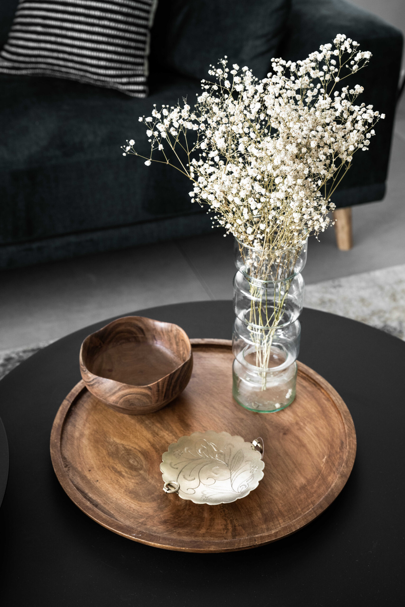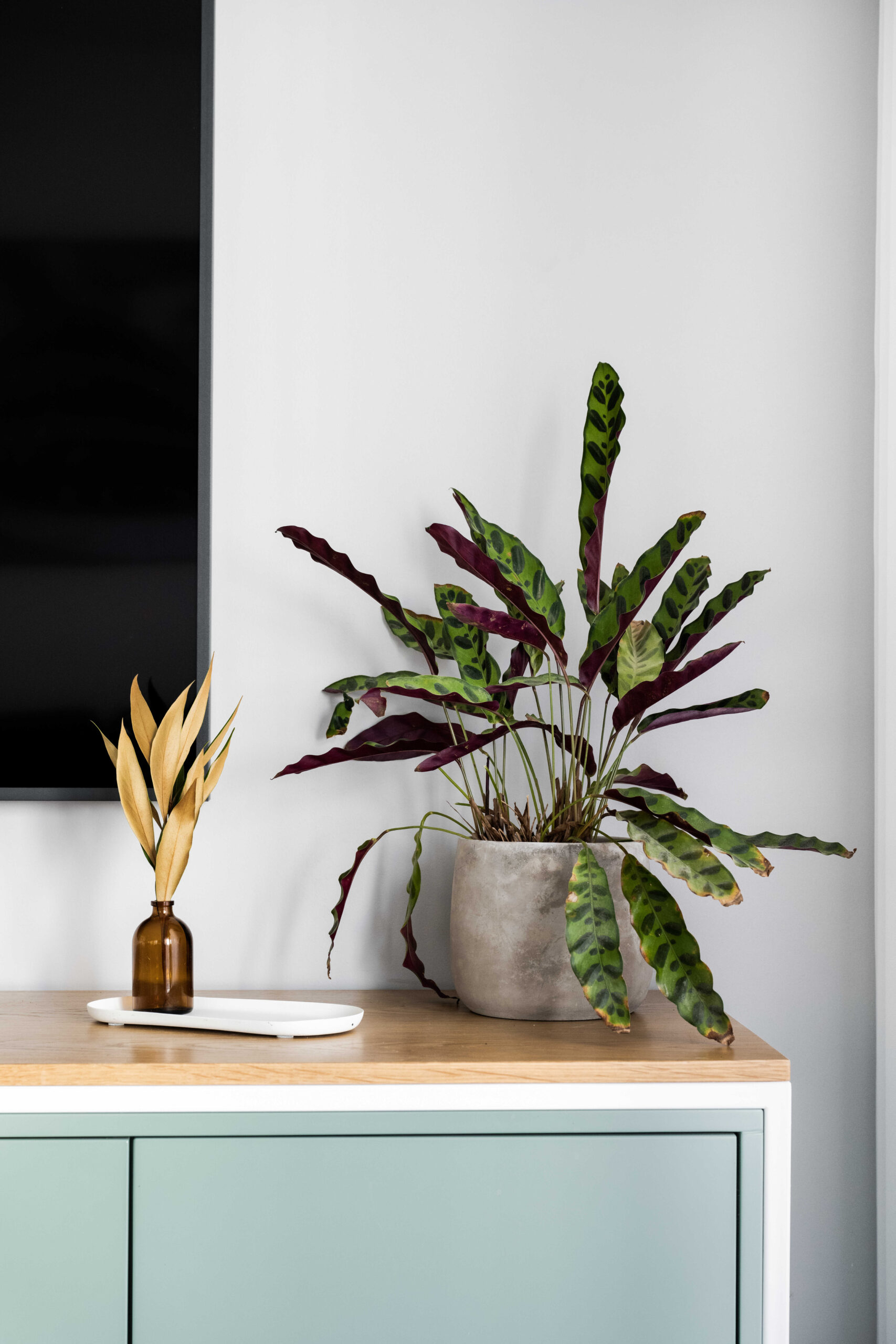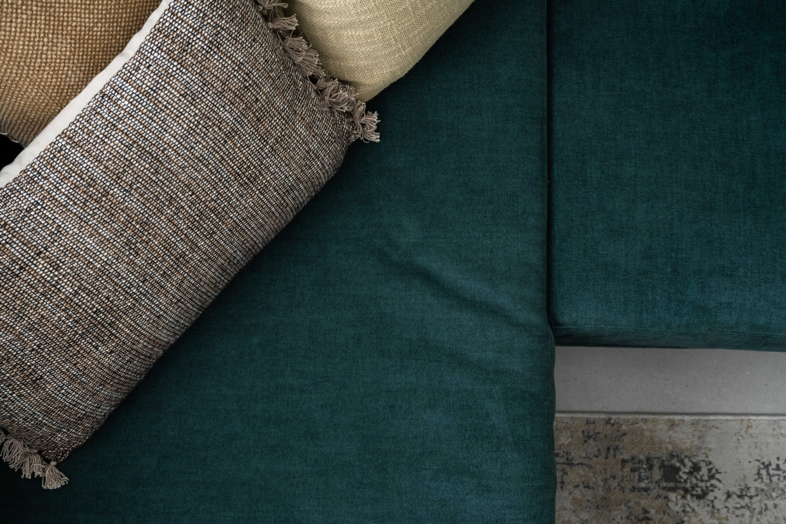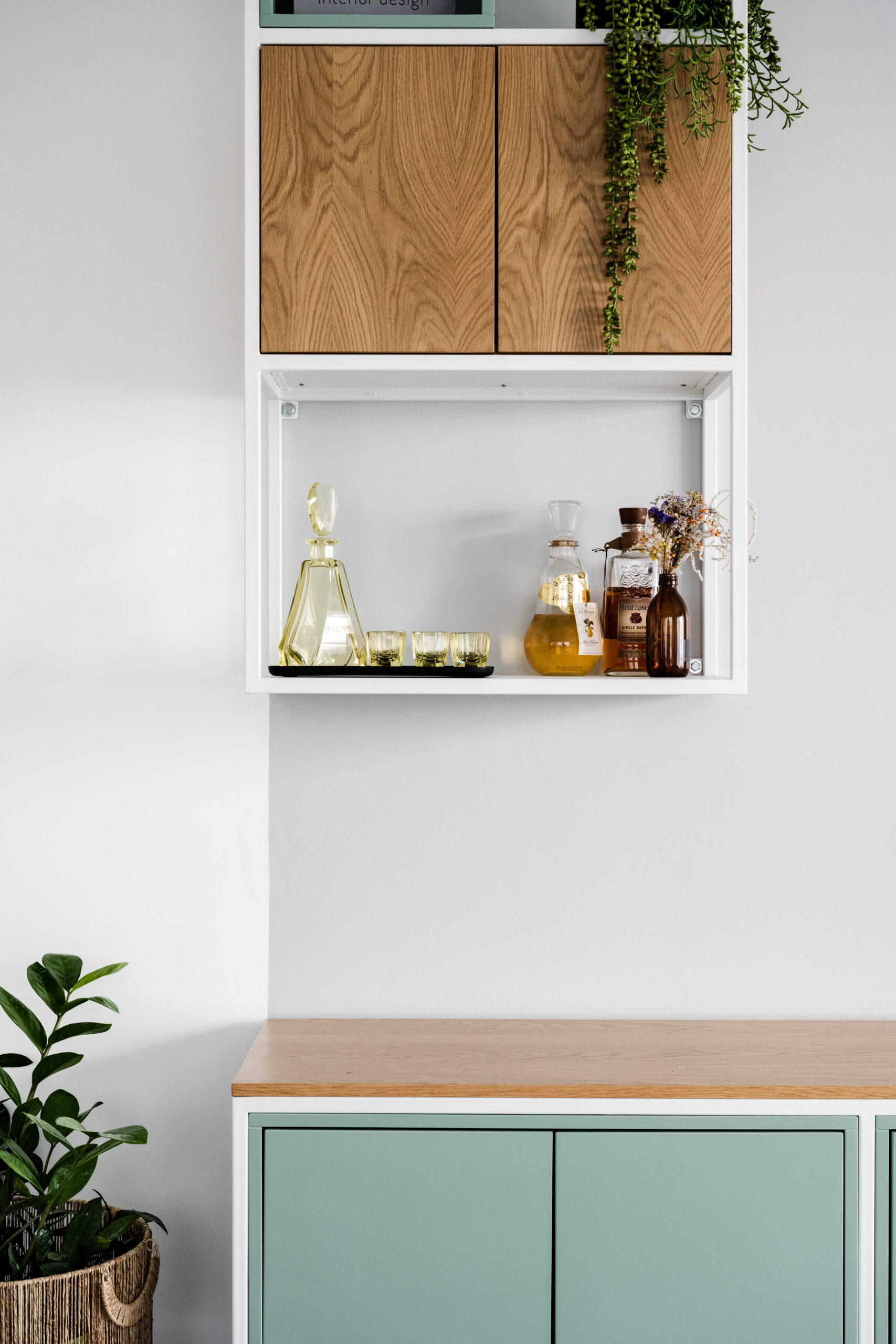 הסלון קיבל ספה צבעונית ורכה שהפכה לאלמנט כוח מרכזי, לצד שולחנות דקים ושטיח מאזן. בקיר הסלון תוכננה נגרות מסגרות אישית – פתרון אחסון ואסתטיקה המשתרע לאורך חמישה מטרים.