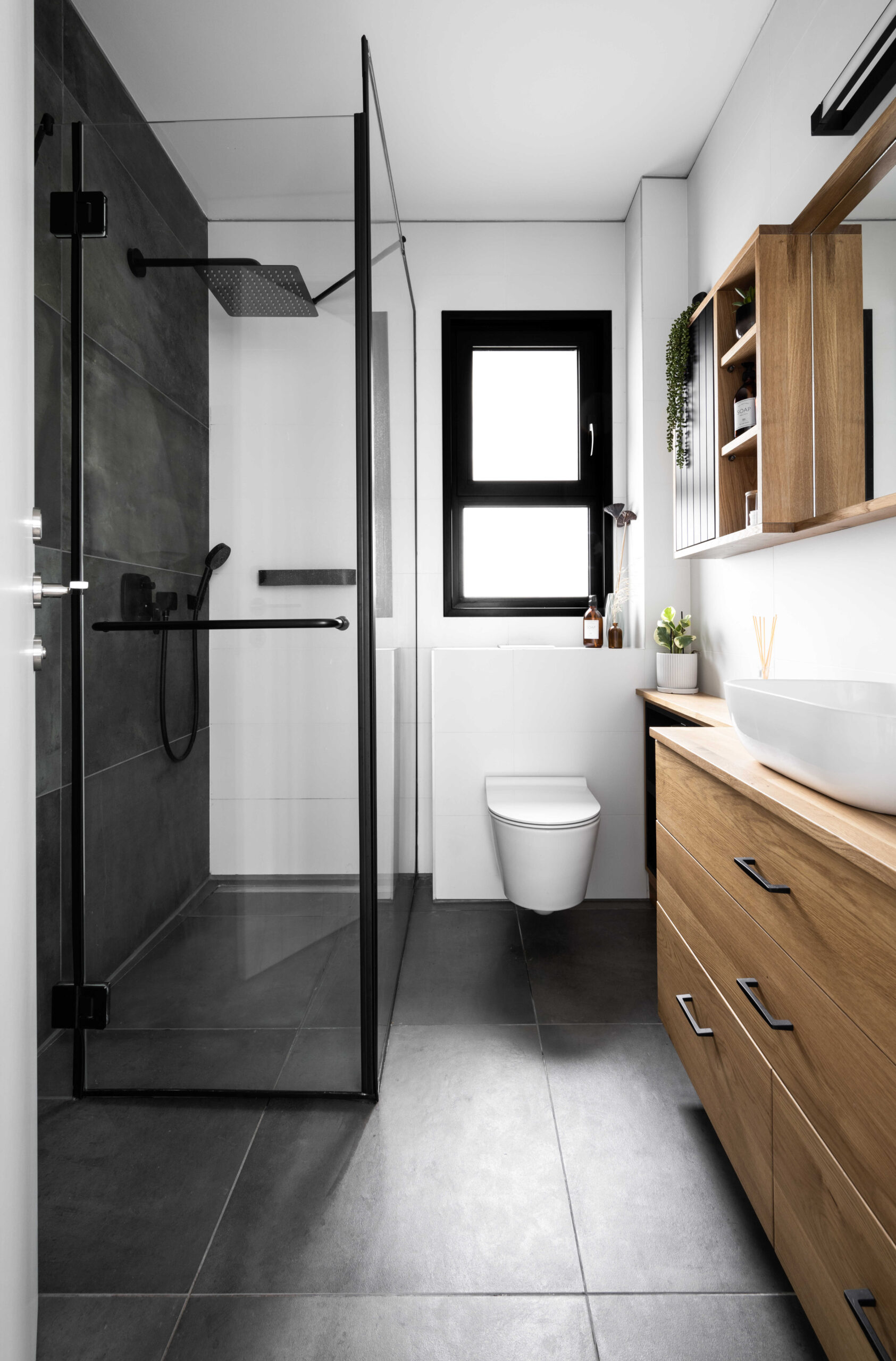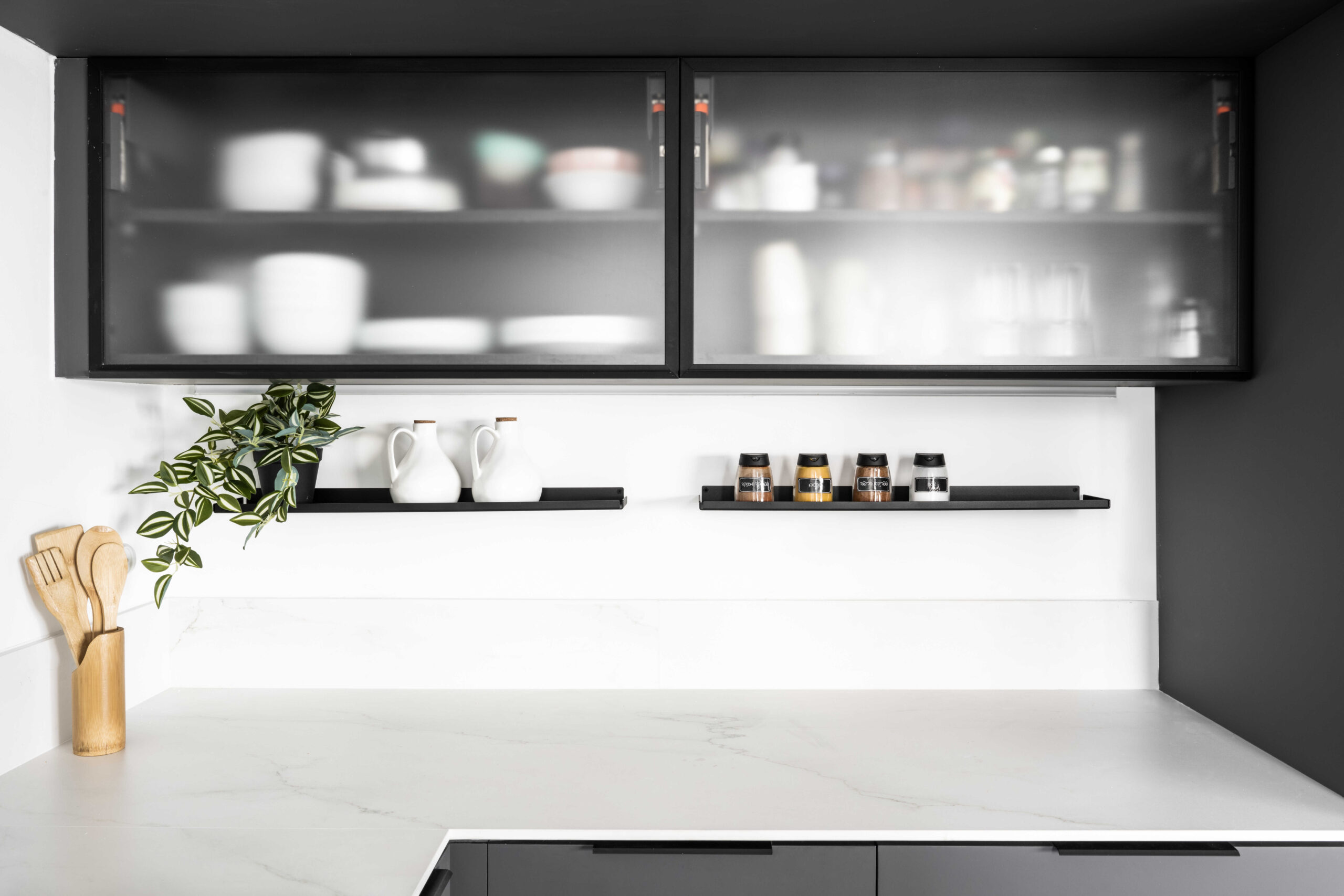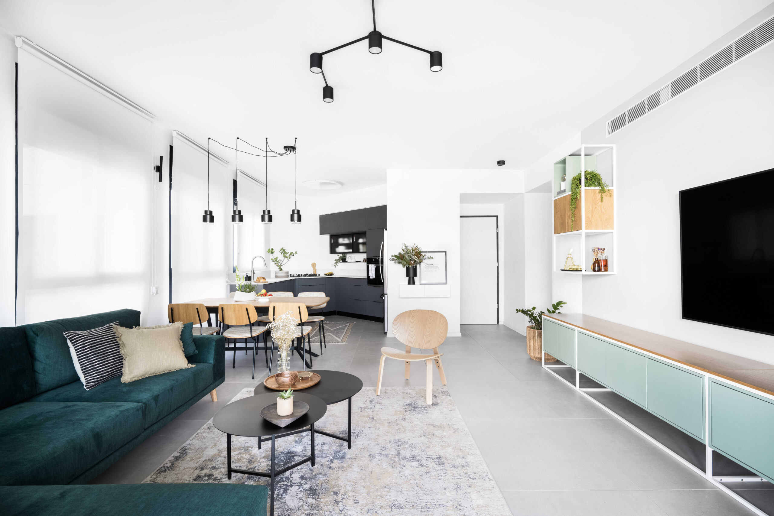 בפרויקט זה נכנסנו למעטפת קיימת ובנינו סצנה הרמונית סביב האלמנטים שלא ניתן לשנות – מטבח, חשמל, תאורה ואלומיניום. המטבח נשמר מינימליסטי, פינת האוכל נבחרה בקפידה עם נגיעת עץ חמה, וגוף התאורה הותאם במדויק לחלל.