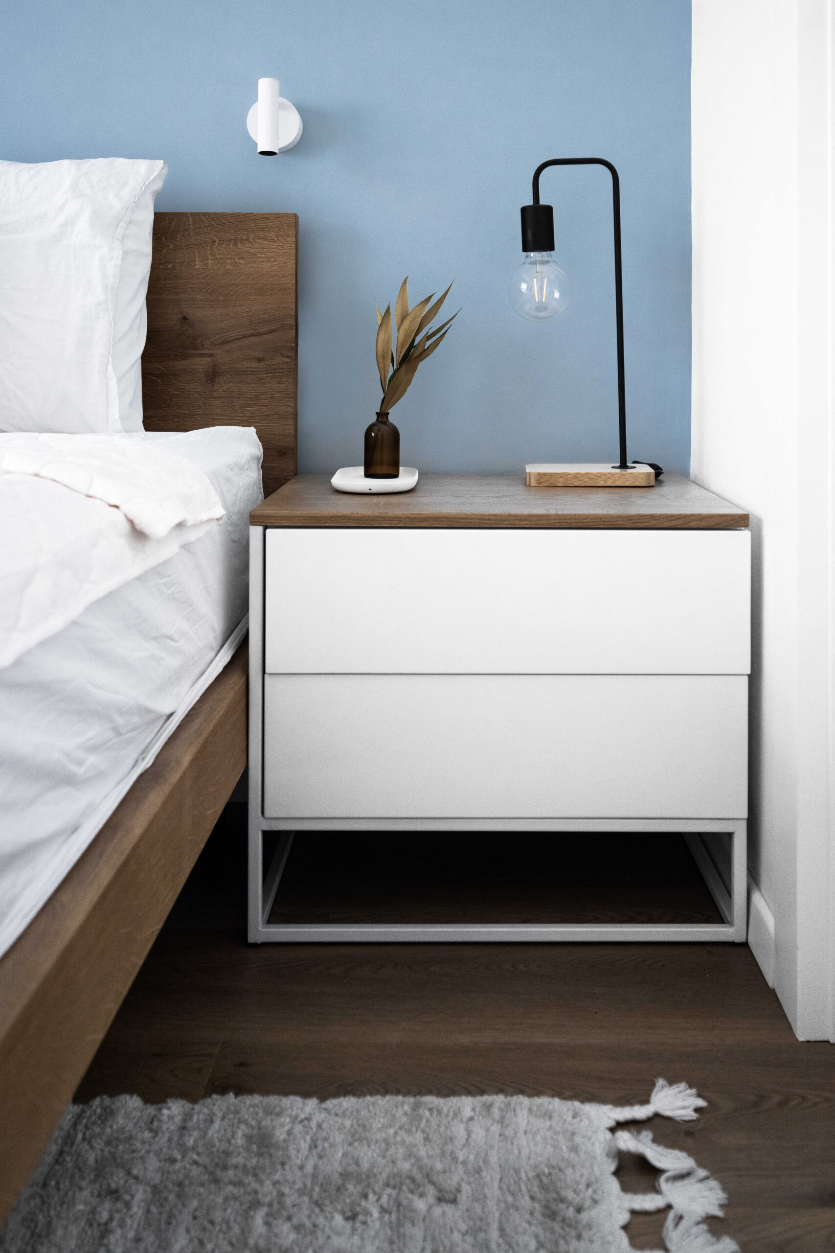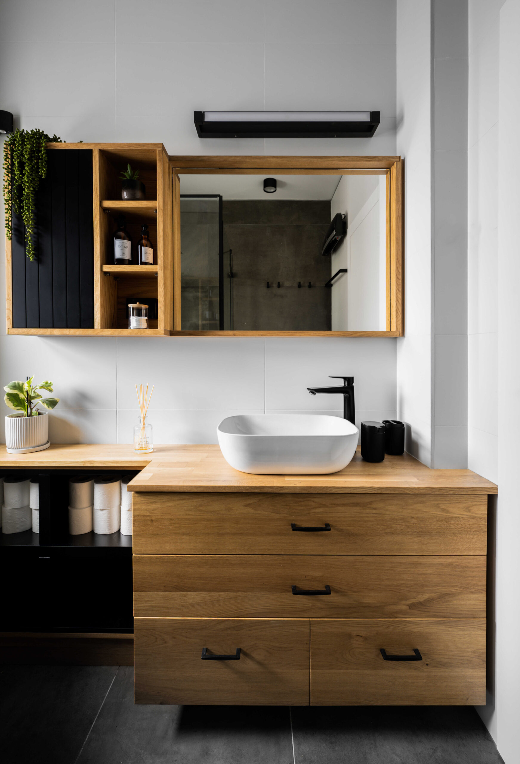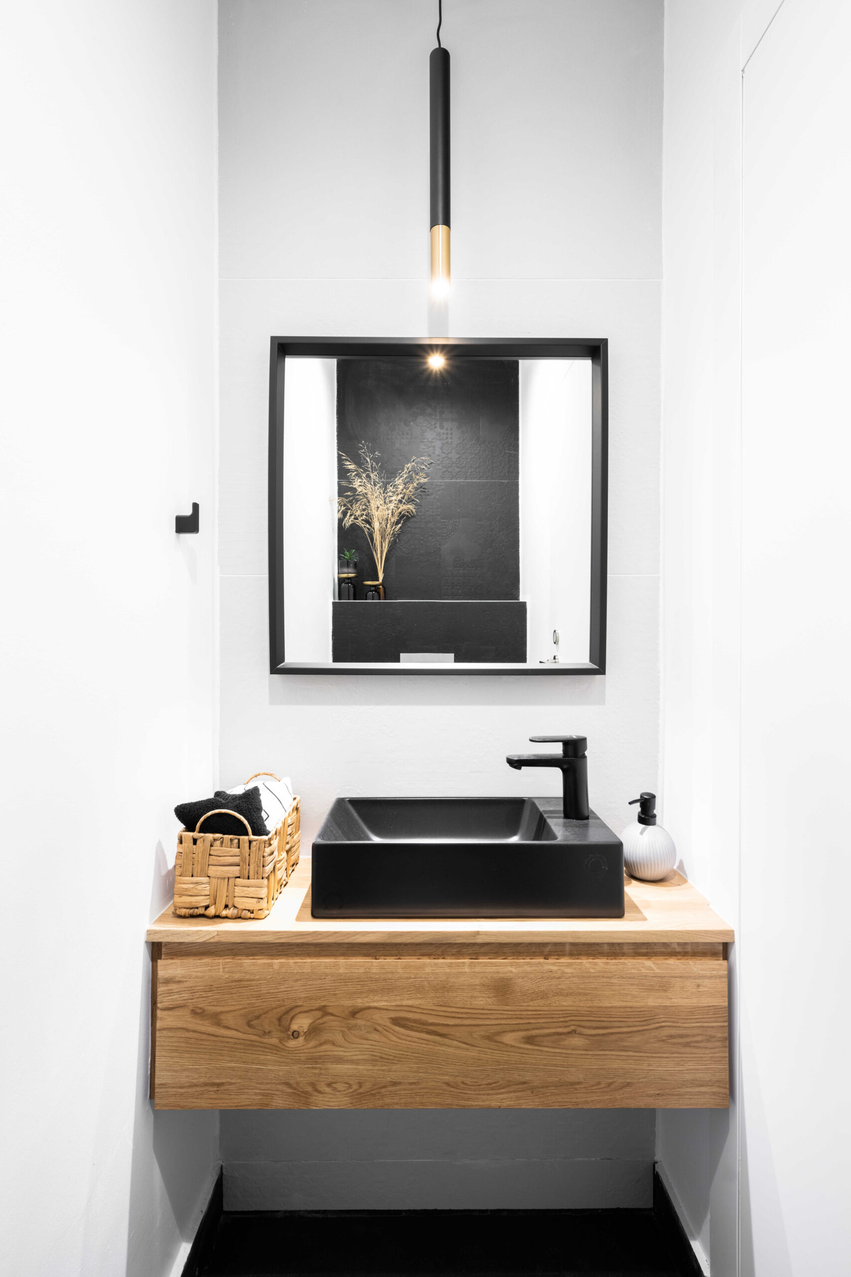 בפרויקט זה נכנסנו למעטפת קיימת ובנינו סצנה הרמונית סביב האלמנטים שלא ניתן לשנות – מטבח, חשמל, תאורה ואלומיניום. המטבח נשמר מינימליסטי, פינת האוכל נבחרה בקפידה עם נגיעת עץ חמה, וגוף התאורה הותאם במדויק לחלל.