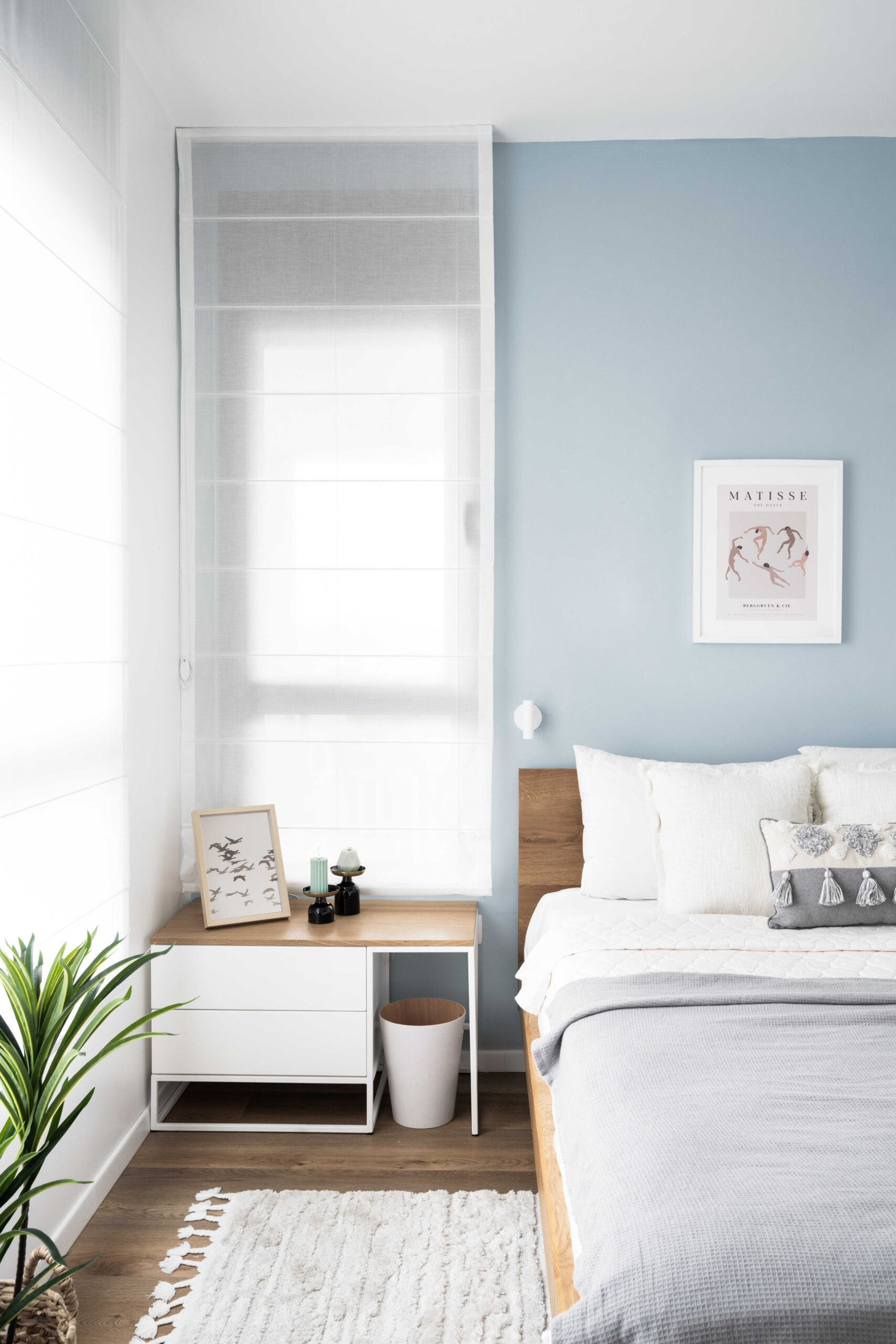 חדר השינה ההורי עוצב ברכות ובחומרים טבעיים, עם טקסטיל בהיר ונגרות בהתאמה אישית לשידות ולמקלחת. חלל הרחצה קיבל כיור כפול וצבעים המשתלבים עם אריחי רצפה ייחודיים.